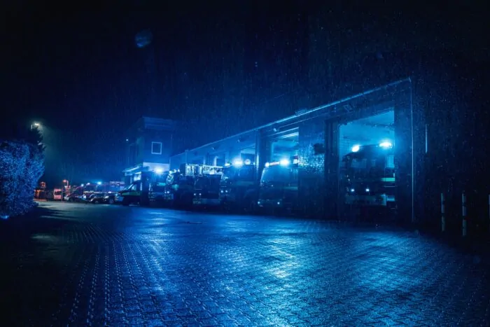 Da stand der Hallenkomplex von 50 mal 50 Metern bereits komplett in Flammen. Die Feuerwehr setzte sogleich zur Brandbekämpfung zwei Wenderohre über Drehleitern und mehrere mobile Rohre ein. Der Einsatzschwerpunkt war eine weitere Brandausdehnung zu verhindern und das angrenzende Depot der Straßenbahnen zu schützen.