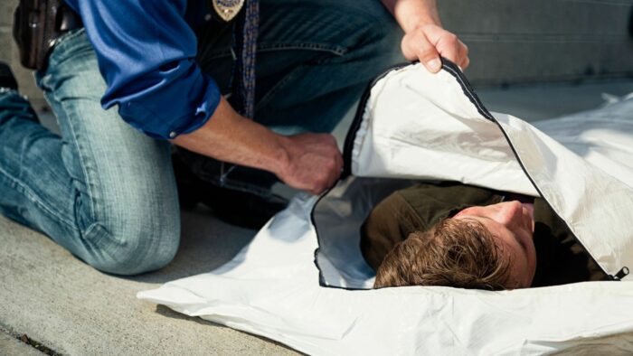 Gerade als das Fahrzeug durch das Haupttor das Krankenhausgelände verlässt und eine Kurve fährt, fällt eine in weiße Laken gewickelte Leiche mit einem dumpfen Schlag auf der Straße.
