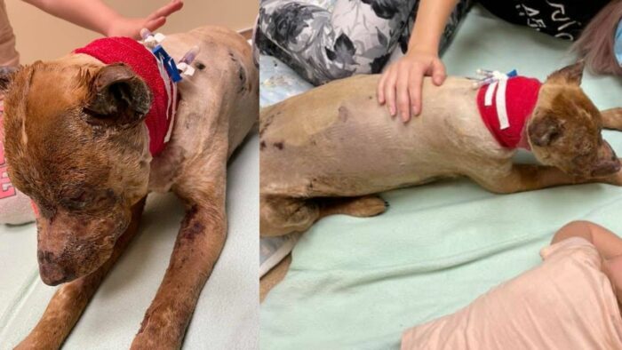 Hündin „Dixie“ wurde absichtlich vom Ex-Freund seiner Halterin angezündet und einfach an einem Straßenrand hingeschmissen. Das unschuldige Tier litt furchtbar und den schweren Verbrennungen.