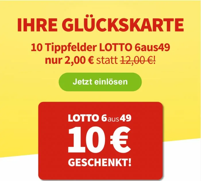 Für kurze Zeit können sich Erstspieler einen 10€ Rabatt sichern und online auf die Gewinnzahlen tippen. Exklusiv für die Ziehung am Samstag, den 3. Juli 2021 erhalten Neukunden hier 10 Felder für nur 2€ (statt 12€).