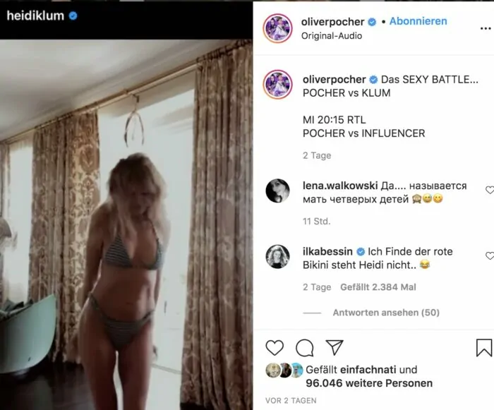Gefundenes Fressen für Oliver Pocher, welcher aus der heißen Tanz-Einlage sofort eine Comedy-Show machte. In einem roten Bikini und blonder Perücke tanzte er wie ein Baywatch-Babe durch sein Schlafzimmer. Seine Comedy-Variante betitelte er auf Instagram mit: „Das SEXY BATTLE … POCHER vs KLUM“.