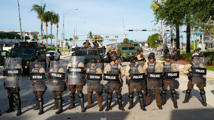 „Wir haben festgestellt, dass er eine Schutzweste trug und mehrere Waffen bei sich hatte“, sagte sie. Bei einer Waffe handelte es sich vermutlich um ein Gewehr vom Typ AR-15, bei einer anderen um eine Handfeuerwaffe, sagte Outlaw.