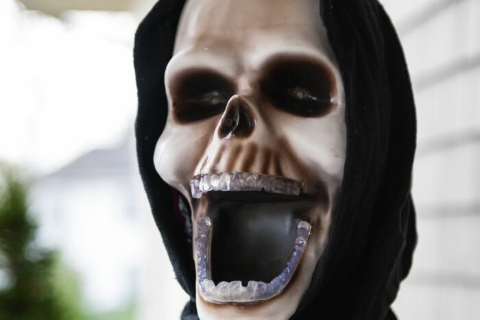 Der Mann, der das Messer in der Hand hielt, war schlank und trug ein dunkles Skelett-Kostüm. Sein Gesicht war schwarz geschminkt.