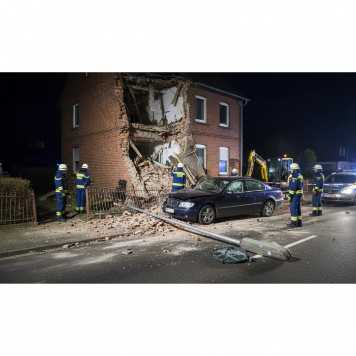 In der Nacht ereignete sich ein schwerer Unfall im Kreis Leer, als ein Fahrzeug mit hoher Geschwindigkeit in ein Wohngebäude krachte und Teile der Seitenwand zum Einsturz brachte. Der 23-jährige Fahrer aus Weener war laut Angaben der Polizei mit seinem Auto nach links von der Fahrbahn abgekommen. Zunächst streifte er eine Straßenlaterne, bevor er gegen das Wohnhaus prallte und anschließend noch einen Zaun beschädigte.