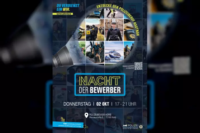 Am Donnerstag, den 2. Oktober, von 17 bis 21 Uhr, wird die „Nacht der Bewerber“ bei der Polizei Baden-Württemberg im Rahmen der Nachwuchsgewinnung landesweit stattfinden.