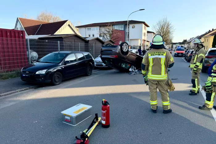 Um 17:00 Uhr wurde ein weiterer Vorfall in der Händelstraße gemeldet. Aus bisher ungeklärten Gründen hatte sich dort ein Fahrzeug überschlagen und lag auf dem Dach. Der Fahrer konnte sich selbst befreien und wurde vom Rettungsdienst untersucht, musste aber nicht ins Krankenhaus gebracht werden. Die Feuerwehr half bei der Verkehrsabsicherung. Die Händelstraße musste zwischen Viernheimer Straße und Wormser Straße vollständig gesperrt werden. Ein weiteres Fahrzeug wurde beschädigt. Nach Sicherstellung des Brandschutzes und Kontrolle der Unfallfahrzeuge rückten die Einsatzkräfte wieder ein. Die Polizei hat die Ermittlungen zur Unfallursache aufgenommen.