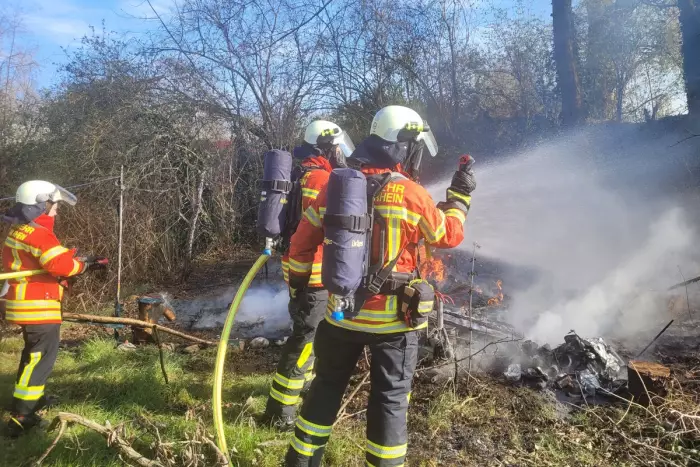 Ein Wohnwagen brannte am Rheinufer, Feuer erfolgreich gelöscht und Einsatz beendet.