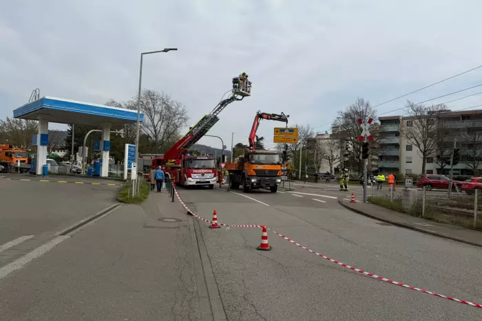 Die Feuerwehr sicherte einen schiefen Ampelmast an einer Straßenbahntrasse in Weinheim. Der Bahnverkehr musste während der Maßnahmen eingestellt werden.