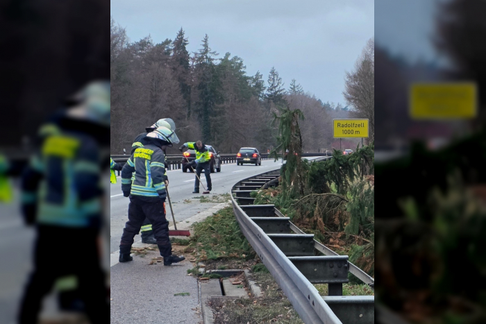 Gegen 16:00 Uhr fiel ein etwa 15 Meter hoher Baum auf die B 33 und blockierte die rechte Fahrspur. Die Feuerwehr musste den Baum von der Straße entfernen, um den Verkehr wieder fließen zu lassen.