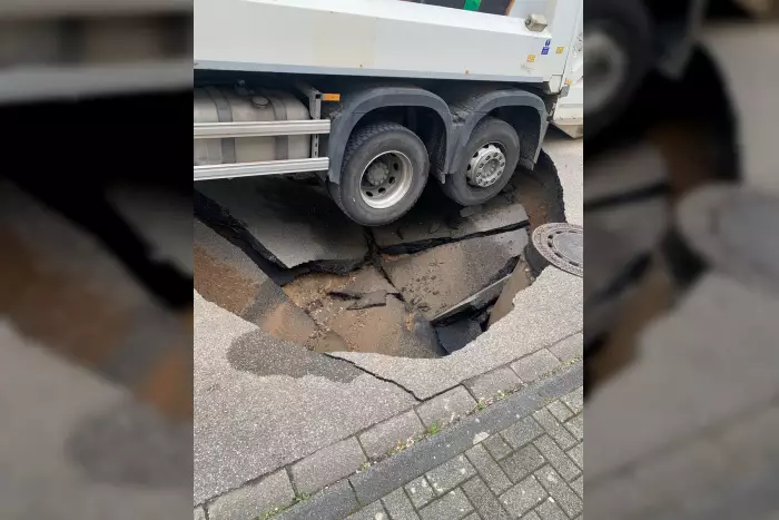 Am Dienstagmittag um 12 Uhr öffnete sich plötzlich die Erde in der Mozartstraße. Das hintere Ende eines Fahrzeugs der Altglasabholung brach durch die Asphaltdecke und fiel in ein Loch von 5 Metern mal 5 Metern Größe und 2 Metern Tiefe. Auch ein geparkter Opel Astra rutschte in den Boden. Ersten Untersuchungen zufolge wurde der betroffene Straßenabschnitt zuvor stark ausgehöhlt. Zum Glück wurde bei dem Vorfall niemand verletzt. Ein Mitarbeiter des Entsorgungsunternehmens, der auf dem Trittbrett des Fahrzeugs saß, kam mit einem Schrecken davon. Die genaue Höhe des entstandenen Schadens ist noch nicht bekannt. Die Bergungsarbeiten sind noch im Gange.
