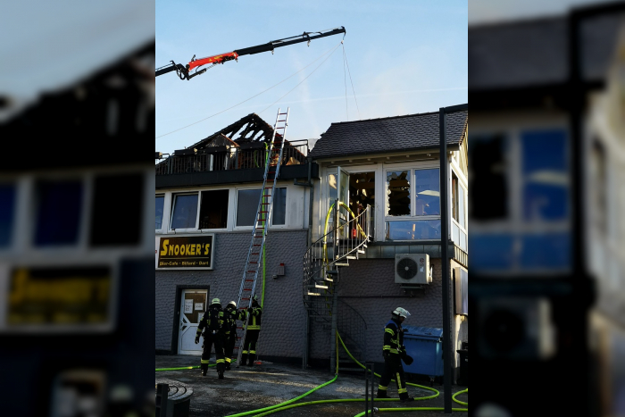 Feuerwehr bekämpft Brand in Wohn- und Gaststättengebäude, keine Verletzten, über 180 Rettungskräfte im Einsatz.