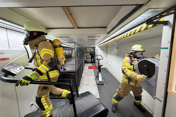 Feuerwehrleute müssen jährlich Belastungsübungen absolvieren, um fit für den Atemschutzeinsatz zu sein. Die Übung beinhaltet kriechen durch enge Rohre und besteigen einer Endlosleiter.