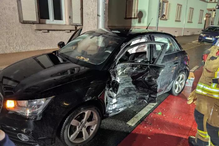 Feuerwehr Weinheim rückt aus, um PKW und Straßenbahn-Unfall zu lösen. Fahrzeug stark beschädigt, eine Person verletzt ins Krankenhaus gebracht.