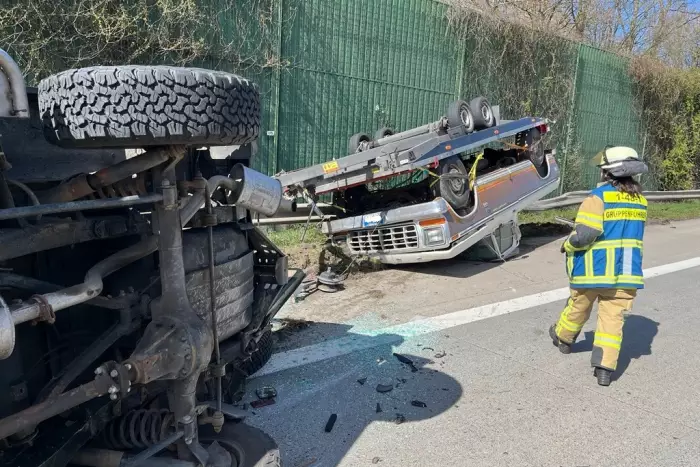 Ein Fahrzeuggespann transportierte einen historischen Wagen. Beim Unfall kam das Zugfahrzeug auf der Beifahrerseite zum Stillstand, während der Anhänger auf dem Dach des Oldtimers liegen blieb. Es waren keine weiteren Fahrzeuge beteiligt.