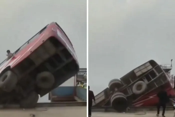 🇧🇩 In Rajbari area (Daulatdia ferry terminal) in Bangladesh. A passenger bus traveling to Dhaka and carrying about 50 people lost control while trying to Drive onto the ferry and fell into the Padma River. 17 deaths were reported. pic.twitter.com/YuPEL7hxUp