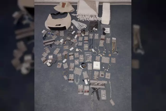Es wird behauptet, dass die Verdächtige gegen 15:25 Uhr mehrere Schmuckstücke (75 Gegenstände im Wert von mindestens 949,05 EUR) aus einem Modeschmuckladen genommen und in eine gestohlene Handtasche gesteckt hat.
