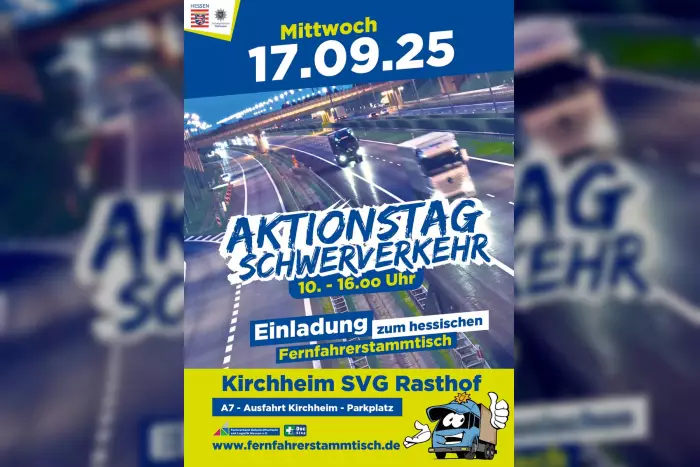 Kirchheim. Die Direktion Verkehrssicherheit und Sonderdienste des Polizeipräsidiums Osthessen richtet in Kooperation mit dem „Fernfahrerstammtisch Hessen“ am Mittwoch (17.09.) auf dem Gelände des SVG-Autohofes in Kirchheim, von 10 bis 16 Uhr, erneut einen großangelegten Aktionstag aus. Dieser soll Interessierten die nicht alltägliche Möglichkeit bieten, bei verkehrspolizeilichen Kontrollen des gewerblichen Güter- und Personenverkehrs „hautnah“ dabei sein zu können.