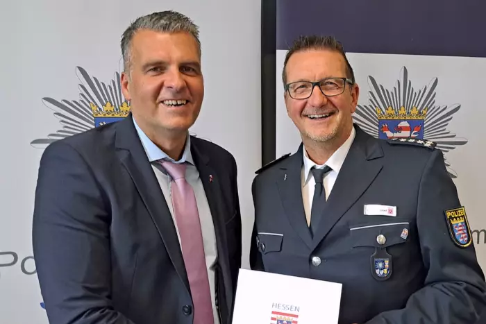 Polizeivizepräsident Dirk Fornoff beglückwünschte am 30. September 2025 den Ersten Polizeihauptkommissar Dirk von Hammel zur Übernahme der Leitung der Polizeistation Ober-Ramstadt.