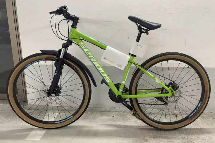 Das erste Rad ist ein silbernes Fahrrad der Marke „Staiger“, Modell „Florida“. Das andere ist ein grünes Fahrrad der Marke „Serious“, Modell „Rockville“. Auffällig ist ein Aufkleber auf dem Oberrohr, der von der Radfahrausbildung der Polizei stammt.