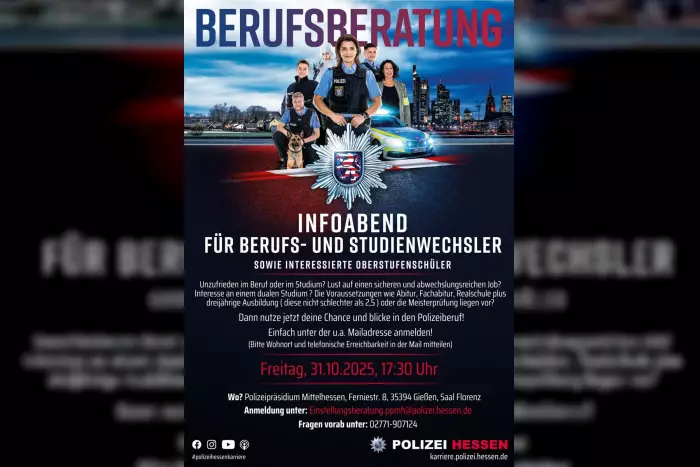 Die mittelhessische Polizei bietet erneut eine besondere Veranstaltung an. Nach den erfolgreichen Events in den vergangenen Jahren lädt die Einstellungsberatung des Polizeipräsidiums Mittelhessen am Freitag, den 31. Oktober, ab 17.30 Uhr zu einem Informationsabend ins Gießener Präsidium ein. Die Veranstaltung im Saal Florenz richtet sich hauptsächlich an Berufstätige und Studierende. Auch Schüler der Oberstufe können teilnehmen, sofern noch Plätze verfügbar sind.