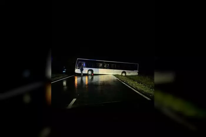 Um 21.35 Uhr informierte ein Autofahrer die Polizei darüber, dass ein Bus die Straße blockierte, woraufhin die Beamten eingriffen. Es stellte sich heraus, dass der Bus stecken geblieben war und mit der Hinterachse über dem Straßengraben hing. Der Fahrer gab an, sich verfahren zu haben und den Bus wenden zu wollen – so zumindest das Navi.