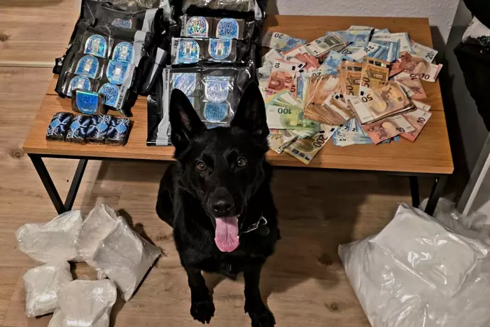 Bildquelle: Polizeipräsidium Südosthessen (Diensthund „Shadow“ vor den sichergestellten Beweismitteln).