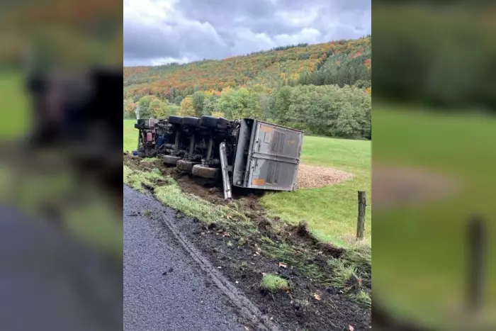 Ein Sattelzug mit Hackschnitzeln kam von der Fahrbahn ab und stürzte um. Der Fahrer wurde leicht verletzt und die Bergung gestaltet sich schwierig.