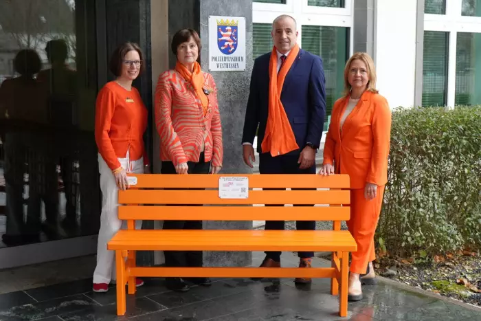 Am Freitag, dem 05. Dezember enthüllten Polizeipräsident Björn Gutzeit, Polizeivizepräsidentin Katrin Thaler, zusammen mit der Präsidentin des Zonta Clubs Wiesbaden, Frau Engel, sowie der stellvertretenden Gebietsleiterin, Frau Riemann, vor dem Polizeipräsidium gemeinsam eine orangefarbene Bank, die ein sichtbares Zeichen gegen Gewalt an Frauen setzt und gleichzeitig über eine darauf angebrachte Plakette konkrete Hilfe über Notrufnummern und Anlaufstellen vermittelt. Unter der Planung von Polizeihauptkommissarin Stephanie Barone aus dem polizeilichen Stabsbereich Prävention, nutzten weiterhin die Gleichstellungsbeauftragte Frau Kathrin Seifert sowie Vertreterinnen und Vertreter aus dem polizeilichen Bereich der Häuslichen Gewalt die Gelegenheit, um in ihren Statements die Bedeutung der Kampagne zu unterstreichen: „Häusliche Gewalt ist nie privat – Hinschauen statt Schweigen, Täter konsequent verfolgen, Solidarität im öffentlichen Raum zeigen, Prävention durch Aufmerksamkeit“. Im Mittelpunkt standen der klare Appell, Gewalt gegen Frauen konsequent entgegentreten, sowie der gemeinsamen Aufruf Betroffene zu schützen und gesellschaftliche Aufmerksamkeit zu stärken.