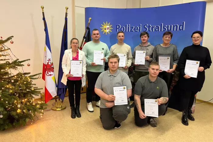 Heute, am Dienstag, den 02. Dezember 2025, wurden zehn Bürger für ihren mutigen Einsatz von Rainer Dittschlag, dem Leiter der Polizeiinspektion Stralsund, zusammen mit dem Kommunalen Präventionsrat des Landkreises Vorpommern-Rügen und dem Verein zur Förderung der Kriminalitätsprävention, geehrt.