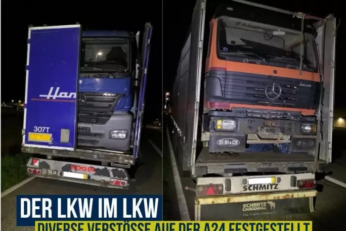 In den vergangenen Tagen hat die Polizei auf der A 24 mehrere Lastwagen gestoppt, die aufgrund schwerwiegender Ladungsverstöße nicht weiterfahren durften. In der Nacht zum Mittwoch wurden allein fünf Lastwagen entdeckt, die unsachgemäß beladen waren, sowohl mit PKWs als auch mit Lastwagen (siehe Bild), obwohl die Anhänger dafür nicht geeignet waren. Dadurch konnte die Ladung nicht gesichert werden, was eine erhebliche Gefahr für die Verkehrssicherheit darstellte. Zudem wurde bei fast allen Fahrzeugkombinationen die erlaubte Gesamthöhe von 4,00 Metern um bis zu einem halben Meter überschritten. Bei einem anderen Transporter wurde eine Überladung von 88 Prozent festgestellt: Bei einem erlaubten Gesamtgewicht von 2500 Kilogramm wurde mittels Radlastwage ein Wert von 6700 Kilogramm für das Fahrzeug gemessen. Die meisten der kontrollierten Fahrzeuge wurden in Hamburg beladen und sollten nach Afghanistan transportiert werden. Die Beamten des Autobahn- und Verkehrspolizeireviers in Stolpe haben die Weiterfahrt in allen Fällen untersagt, bis die festgestellten Mängel behoben wurden. Die betroffene Firma hat für das Wochenende einen Spezialkran beauftragt, um die Fahrzeuge am Autobahnrastplatz Stolpe Süd auf geeignete Transportmittel umzuladen. Gegen die türkischen Fahrer und den Fahrzeughalter wurden Ordnungswidrigkeitenanzeigen erstattet und Sicherheitsleistungen erhoben.