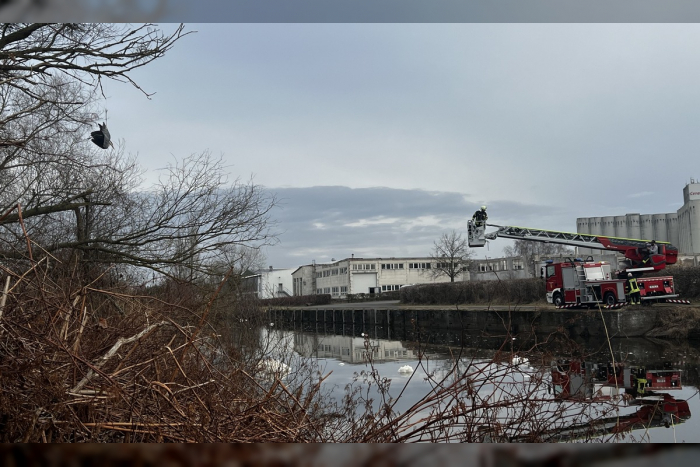 Polizei und Feuerwehr retten Fischreiher aus Baum im Industriegelände. Freiwillige Feuerwehr Malchin befreit ihn erfolgreich.