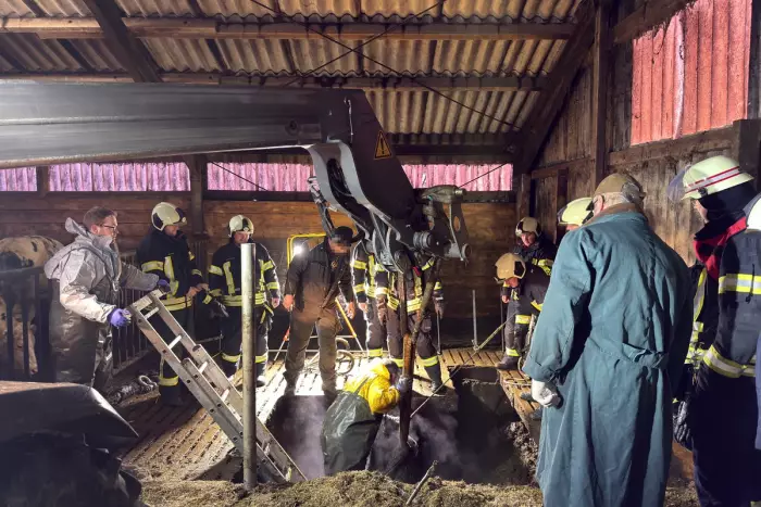 Die Rettung des zweiten Tieres gestaltete sich etwas schwieriger. Um an die versunkene Kuh heranzukommen, griffen die Feuerwehrleute auf Leiterteile zurück, um in der Unterkellerung arbeiten zu können. Einsatzkräfte in Einweg-Schutzkleidung stiegen in die Grube und befestigten ein spezielles Großtier-Rettungsgeschirr, mit dem das Rind teilweise aus der Senke gehoben werden konnte. Anschließend wurden Schlaufen an den Vorderläufen befestigt und die Kuh wurde nach etwas mehr als einer Stunde ebenfalls mit einem Teleskoplader aus der Güllegrube befreit.