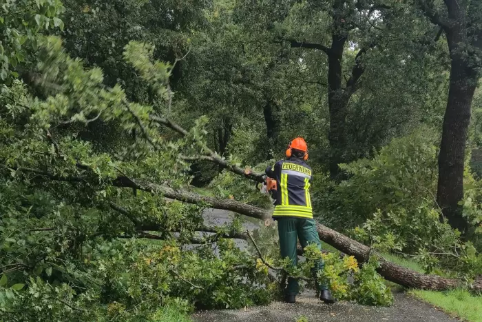 Am Samstagmorgen wurde die Straße Achtert Kipp in Wiesens durch einen umgefallenen Baum blockiert. Außerdem steckten Teile des Geästs in einer nahe gelegenen Telefonleitung fest. Die Feuerwehr Wiesens wurde um 10:18 Uhr gerufen, um den Sturmschaden zu beseitigen. Nachdem die Rettungskräfte die Straße abgesichert hatten, griffen sie zur Kettensäge und schnitten den Baumstamm durch. Dadurch konnte die Telefonleitung schnell von der Last befreit werden, ohne beschädigt zu werden. Danach wurden die restlichen Teile des Baumes entfernt und die Straße wieder freigegeben. Der Einsatz der Feuerwehr vor Ort dauerte etwa eine halbe Stunde.