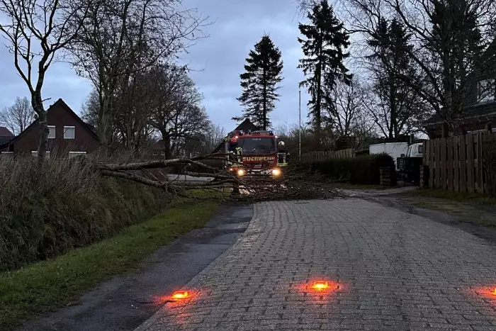 Am Mittwochmorgen war der Moorackerweg in Wiesens von den in der Nacht aufgetretenen und teilweise starken Windböen betroffen. Ein Baum war auf die Straße gefallen und versperrte sie komplett. Die Feuerwehr Wiesens kam, um den Sturmschaden zu beseitigen. Nachdem der Arbeitsbereich abgesichert war, wurde der Baum mit einer Kettensäge in Minuten zerteilt und Stück für Stück von der Straße entfernt. Anschließend wurde die Straße von verbliebenem Schmutz gereinigt. Nach etwa 20 Minuten war die Fahrbahn wieder frei.