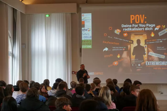 An zwei Vormittagen nahmen insgesamt drei Schulen aus Celle (KAV, Ernestinum, OBS Welfenallee) mit Schülern der Jahrgänge 9 und 10 teil. Im Fokus stand die kritische Auseinandersetzung mit der eigenen „For You Page“: Warum wirken bestimmte Inhalte überzeugend? Wie entstehen einseitige Perspektiven? Und wie schaffen es extremistische Akteure, gezielt Aufmerksamkeit zu erregen?