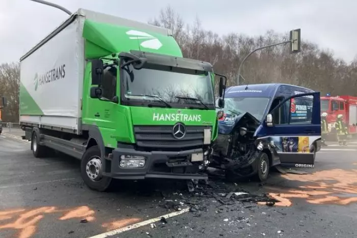 Ein Transporter kollidierte mit einem Lkw nachdem der Fahrer das Rotlicht missachtete. Beide Fahrer wurden leicht verletzt und die Fahrbahn war stundenlang gesperrt.