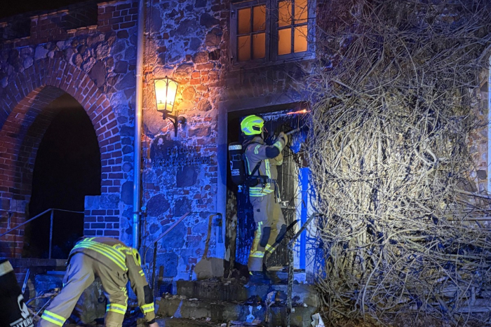 Bei der Ankunft des Einsatzleiters bestätigte sich eine kritische Situation. Die Eingangstür des Gemeindehauses brannte offensichtlich von außen, zudem war unmittelbar vor der Tür abgelegter Unrat in Brand geraten. Die Einsatzkräfte löschten zunächst die brennende Tür sowie das Brandgut vor dem Gebäude ab und öffneten anschließend gewaltsam die Eingangstür, um sich Zugang zu verschaffen. Im Flurbereich wurde eine starke Verrauchung festgestellt, während die angrenzenden Büroräume nicht vom Rauch betroffen waren.