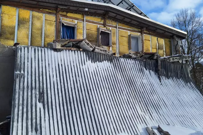 Ein großes Vordach von etwa 4 × 12 Metern konnte dem schweren Schnee nicht mehr standhalten und brach zusammen. Der Einsturz riss auch Teile der Außenfassade mit, wodurch der Haupteingang verschüttet wurde.