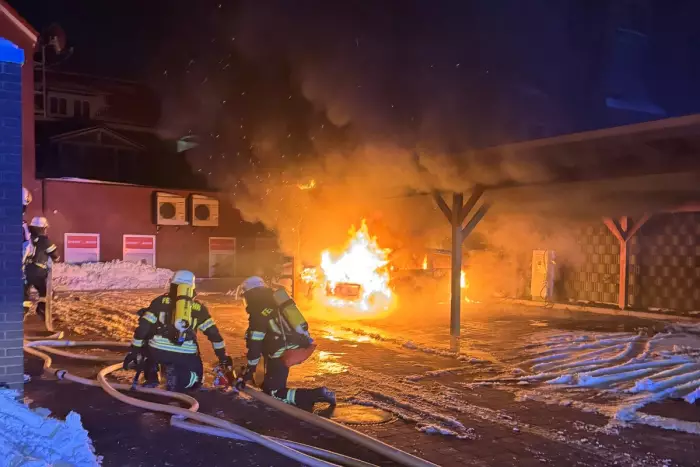 Während der Löschmaßnahmen im Fischteichweg stand ein Elektroauto in Vollbrand. Feuerwehr verhinderte Ausbreitung auf Carport und Wohnhaus.