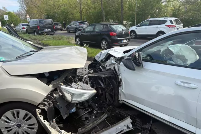 Sechs Verletzte bei Frontalkollision zweier Fahrzeuge auf der Stader Straße. Feuerwehr unterstützt Rettungsdienst und sichert Unfallstelle ab.