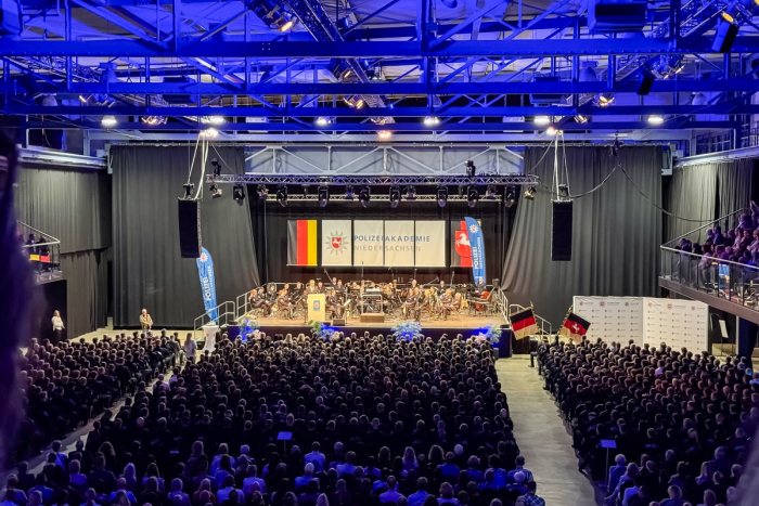Die Vereidigung fand in Halle 39 in Hildesheim statt, in Anwesenheit zahlreicher Angehöriger, Gäste aus Politik und Polizei sowie Vertreterinnen und Vertretern der Kommunen. Das Polizeiorchester Niedersachsen sorgte für eine festliche und bewegende Atmosphäre.