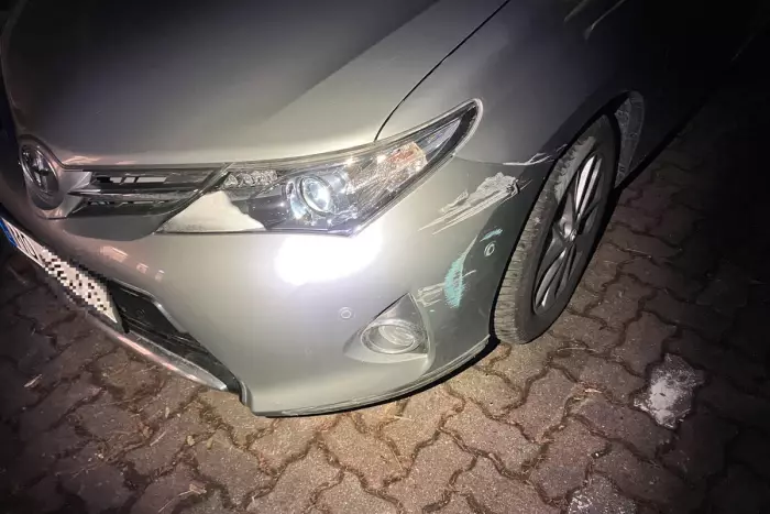 Der beschädigte Wagen hat erhebliche Kratzer an der linken Stoßstange und dem linken Kotflügel, sowie ein Loch im vorderen linken Kotflügel. Der entstandene Schaden wird auf etwa 3.000 Euro geschätzt.