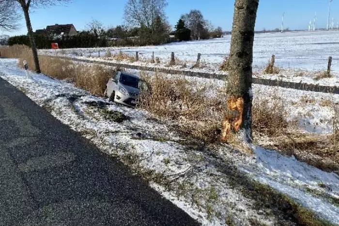 In Nordleda – Am Samstag gegen 11:30 Uhr fuhr der 72-jährige Fahrer eines Ford C-Max die Otterndorfer Straße in Nordleda entlang. Trotz der winterlichen Straßenverhältnisse versuchte er, ein anderes Auto zu überholen, geriet jedoch ins Schleudern, prallte gegen einen Baum und landete schließlich im Graben. Der Fahrer wurde schwer verletzt und anschließend vom Rettungsdienst ins Krankenhaus gebracht. Der entstandene Sachschaden wird auf mehrere Tausend Euro geschätzt. Während der Unfallaufnahme stellten die Polizisten fest, dass am Auto nur Sommerreifen montiert waren und die fällige Hauptuntersuchung bereits mehr als 8 Monate überfällig war. Gegen den Fahrer wurden verschiedene Verkehrsordnungswidrigkeitenverfahren eingeleitet. (Foto im Anhang)