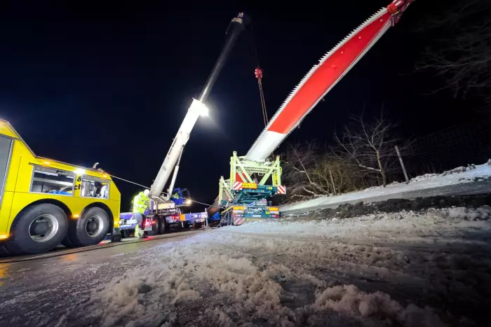 Der Schwertransport war mit einem 72m langen Flügel einer Windkraftanlage beladen. Der 53-jährige Fahrer blieb unverletzt. Der entstandene Sachschaden wird auf 75.000 Euro geschätzt.