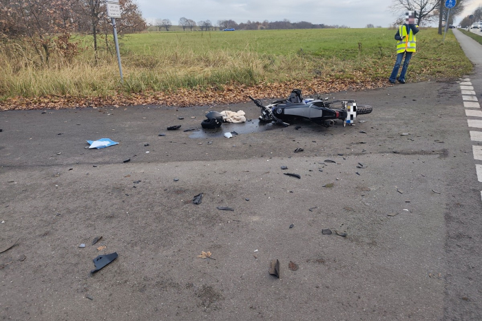 Das Motorrad wurde stark beschädigt und auch der PKW erlitt erhebliche Schäden.