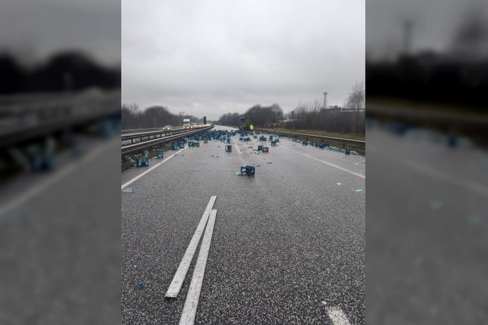 Ein Lkw verliert Wasserkisten, verursacht eine Vollsperrung für 30 Minuten und führt zu Reinigungsmaßnahmen.