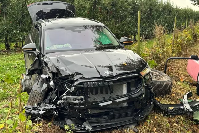 Als der Trecker von der K49 nach links in eine Obstplantage abbog, versuchte der Skoda-Fahrer zu überholen. Er bemerkte den abbiegenden Trecker zu spät und es kam zu einem Zusammenstoß. Beide Fahrzeuge wurden durch die Wucht des Aufpralls nach links in den Seitenraum geschleudert. Der 21-jährige Bliedersdorfer wurde aus der Treckerkabine auf den Grünstreifen geschleudert und erlitt schwere Verletzungen, konnte aber danach selbstständig aufstehen.