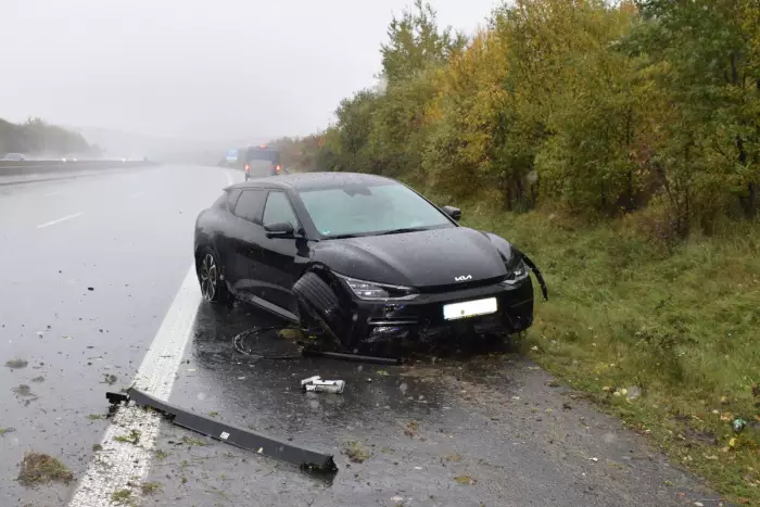 Ein 43-jähriger Mann aus dem Landkreis Tübingen (Baden-Württemberg) fuhr mit seinem KIA, EV6, in Richtung Hannover auf der A7. Im Auto befanden sich eine 41-jährige Beifahrerin und zwei Kinder im Alter von sechs und elf Jahren. Zu dieser Zeit herrschten starken Regen und Sturm.
