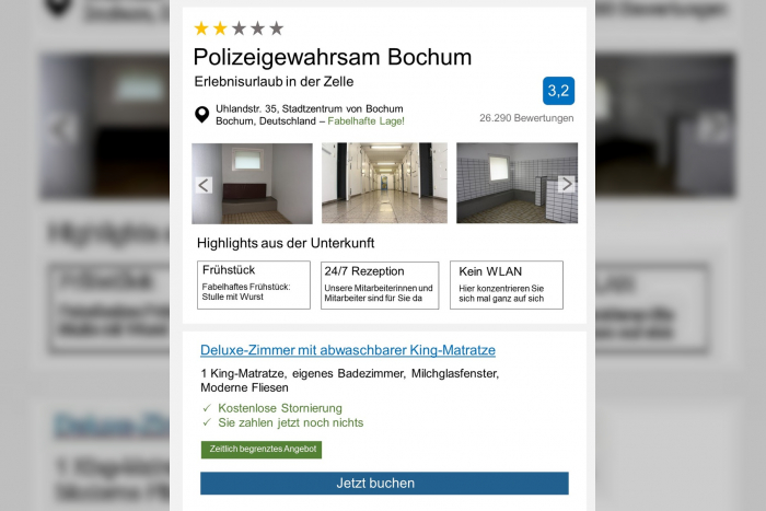 Verbringen Sie Ihren Urlaub an einem ungewöhnlichen Ort: Das Polizeipräsidium Bochum betritt den Tourismusmarkt und bietet einen aufregenden Erlebnisurlaub in einer Gewahrsamszelle. Freuen Sie sich auf eine gemütliche Atmosphäre, ungestörte Ruhe und bodenständige kulinarische Genüsse.