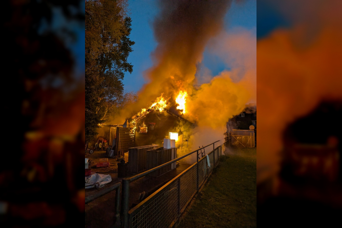 Feuerwehr bekämpft Brand mit explodierter Gasflasche in Vollbrand. Glücklicherweise keine Verletzten bei Löscharbeiten.